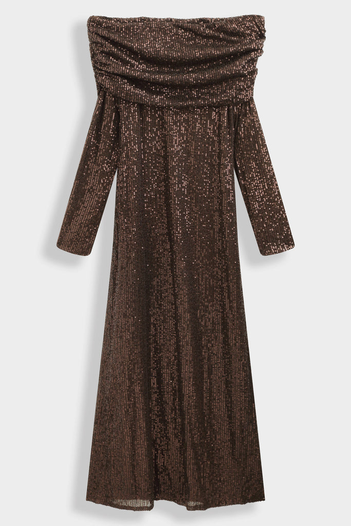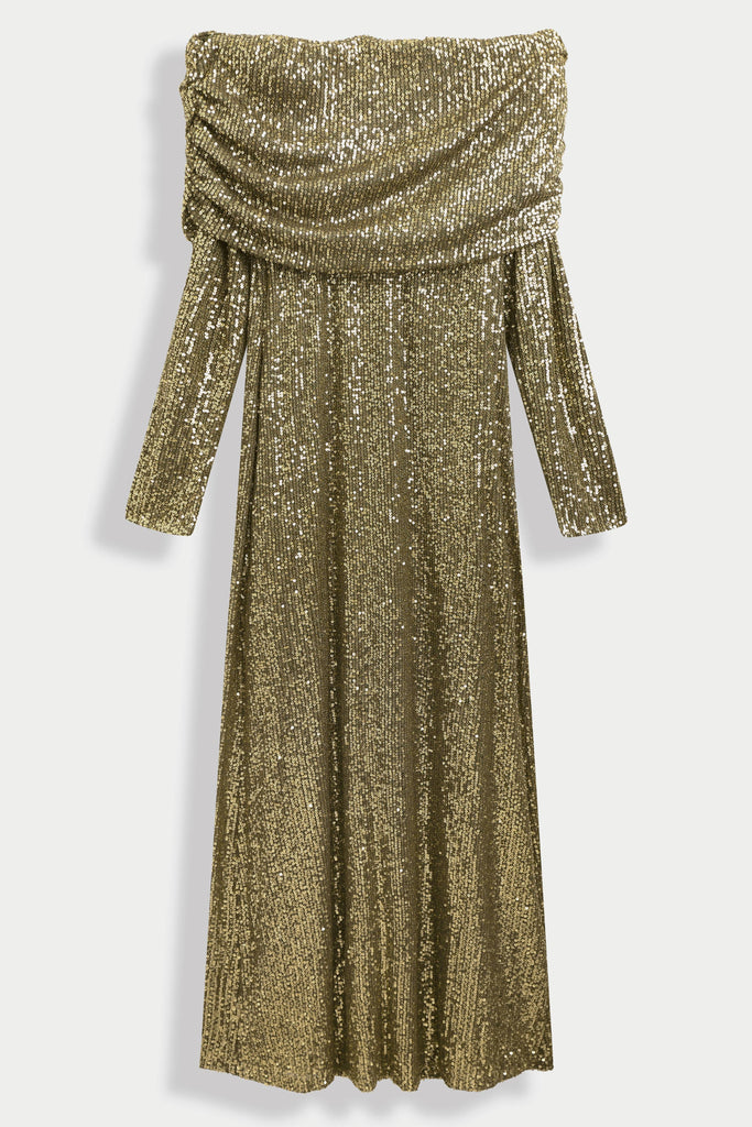 Long sequin dress with draped neckline; Composition: 95% polyester, 5% elastane; Size: S, M, L