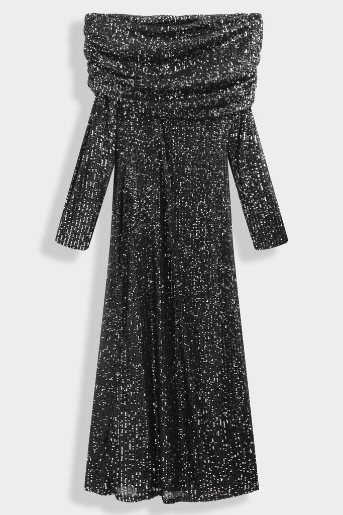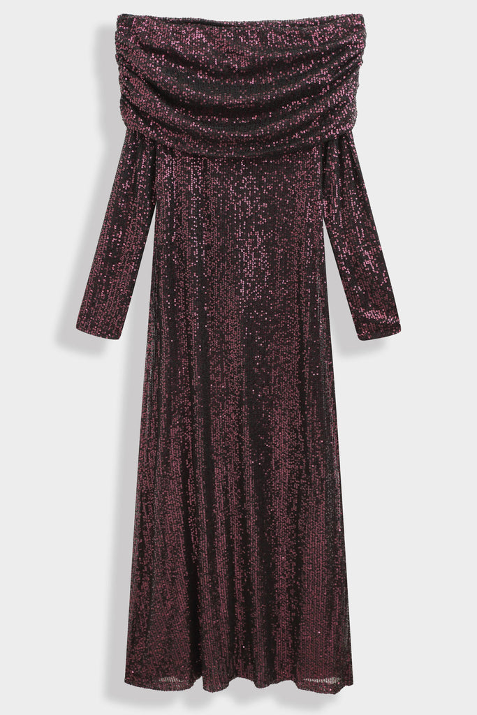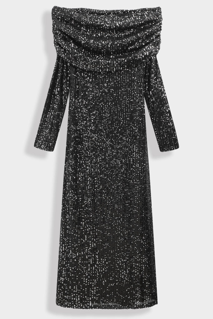 Long sequin dress with draped neckline; Composition: 95% polyester, 5% elastane; Size: S, M, L