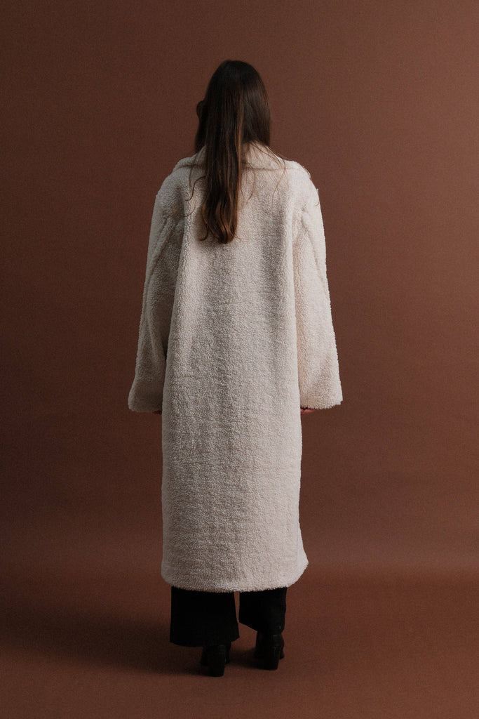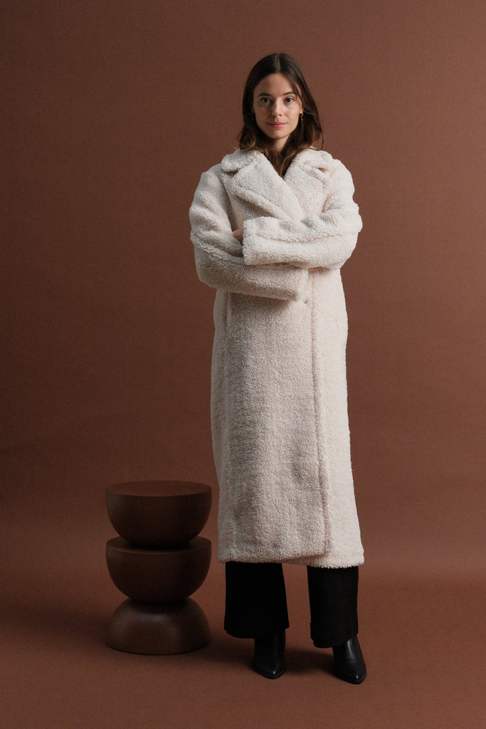 Here is our long teddy bear effect coat, oversized and warm, with a button closure. It's the perfect piece for cool days, wrapping the silhouette in absolute softness.