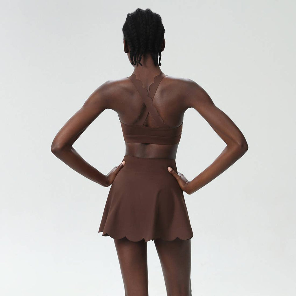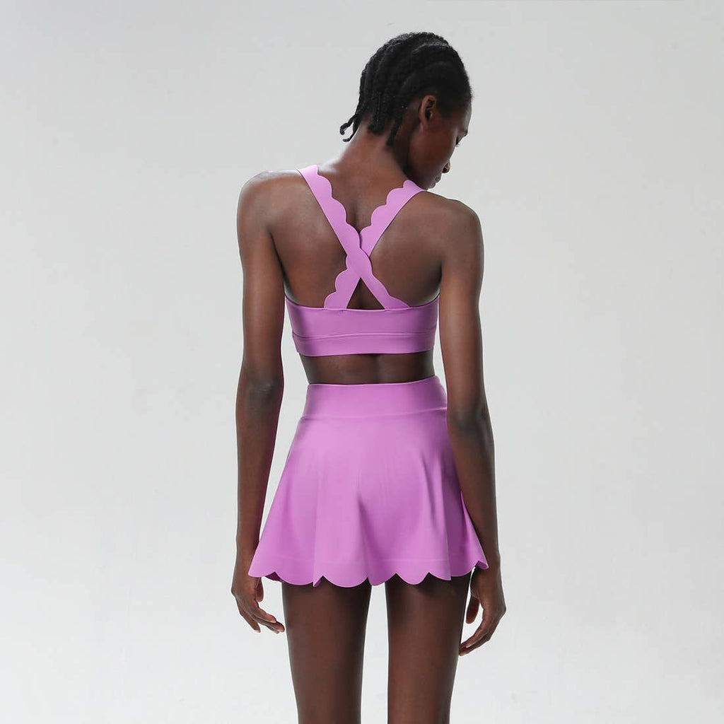 Set Includes: Liquid Seamless Sports Bra + Wave-Hem Tennis Skirt Pattern Type: Solid Color Composition: Bra: 75% Nylon, 25% Spandex (Lycra) Skirt Outer Layer: 75% Nylon, 25% Spandex (Lycra) Skirt Inner Layer: 31% COOLMAX, 61% Polyester, 8% Spandex Key Details: 1.Scalloped Double-Shoulder Straps: Decorative wave-shaped straps with reinforced support for shoulder stability. 2.Adjustable Fit: Removable thin pads for customizable coverage and modesty. 3.Functional Skirt Features: COOLMAX Lining: Moisture-wicking inner layer for breathability. Discreet Side Pocket: Ideal for storing small essentials during activities. Scalloped Edge Design: Wave-patterned hem adds dynamic movement flair. 4.Unlined/Seamless Construction: Smooth texture prevents chafing and visible panty lines. Performance: Mid-weight compression with high stretch for unrestricted motion. Quick-dry fabric adapts to high-intensity workouts.