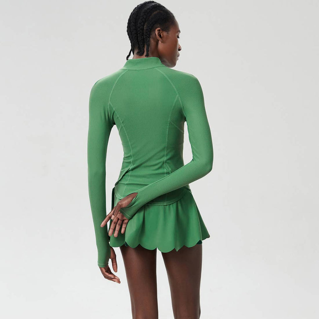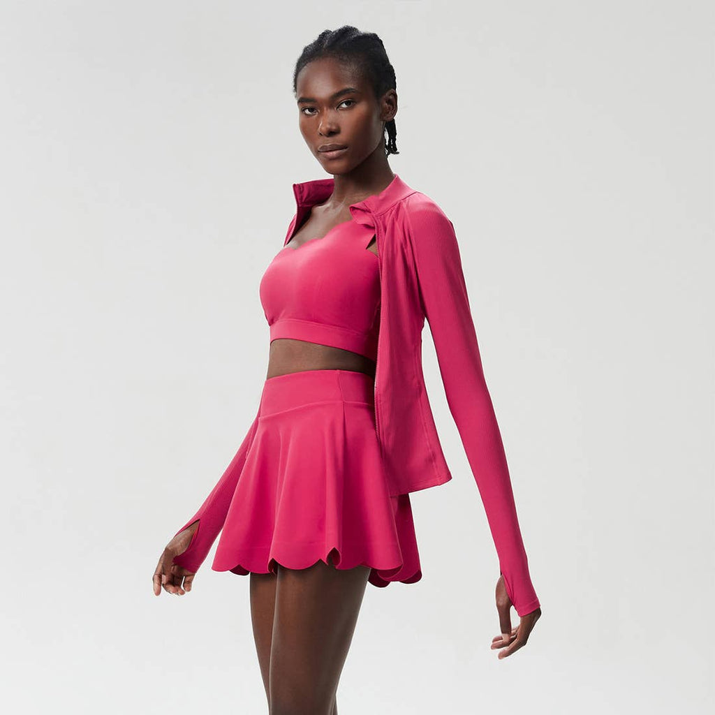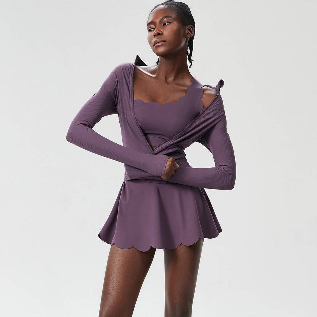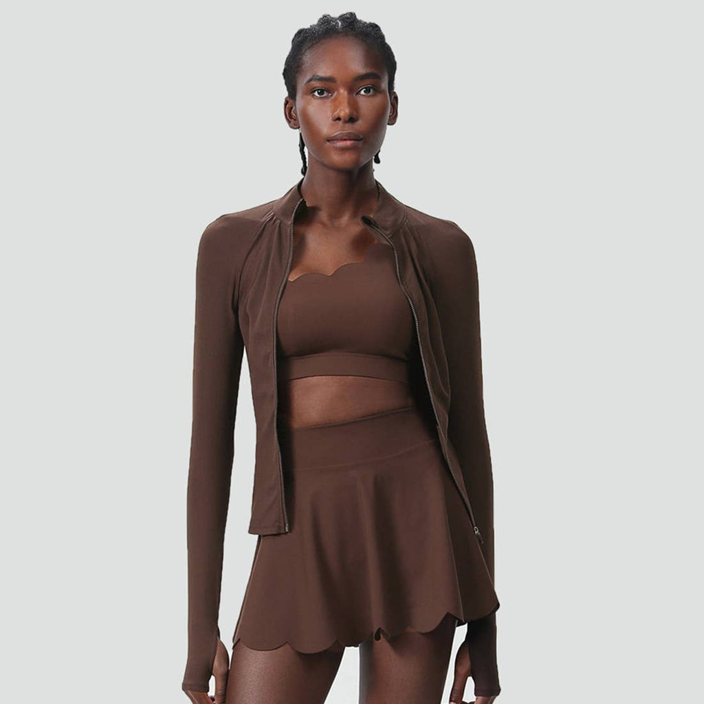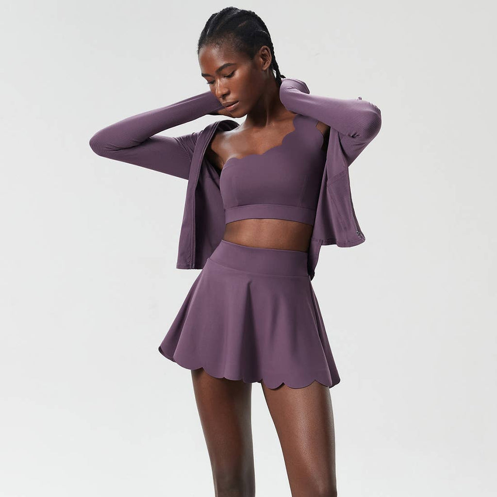 Pattern Type: Plain Fit: Tight Fit (All Pieces) Material Composition: Bra: 75% Nylon + 25% Lycra (Detachable Padding) Skirt: Outer Layer: 75% Nylon + 25% Lycra Inner Layer: 31% COOLMAX® + 61% Polyester + 8% Spandex (Anti-Chafing Lining) Jacket: 78% Nylon + 22% Elastane (Korean Hyosung Spandex) Design & Functional Details: 1.Bra: Single-shoulder strap + crossed back design for secure support, ideal for high-intensity movement. 2.Skort: Flared wave-hem skirt with hidden inner shorts (no-slip silicone grip at hem) Side cargo pocket (left thigh) + moisture-managing COOLMAX® inner layer 3.Jacket: Full-zip closure + ergonomic micro-pressure ribbing for targeted compression at waist. Technical Features: Quick-Dry Technology: Wicks sweat 50% faster than standard sportswear Flatlock Seams: Minimize friction during repetitive motions (tennis serves, yoga poses) Compatibility: ✔️ Tennis / Pickleball / Gym Training ✔️ Running / Hiking / Casual Outdoor