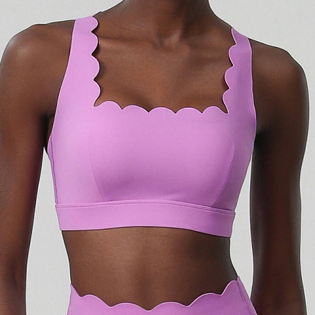 2.Wave-Edged Trim – Unique curved design on bra neckline and shorts hem for dynamic aesthetics.